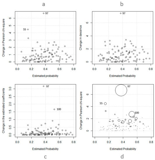 Diagnostic measures for the logistic model, (a) Change in Pearson Chi-square when removing individual covariate patterns from data, (b) Change in deviance when removing individual covariate patterns from data, (c) Change in the estimated coefficients when removing individual covariate patterns from data, (d) Combination of a and c: change in Pearson Ci-square (y-axis) and estimated coefficients (size of circles) when removing individual covariate patterns from data.