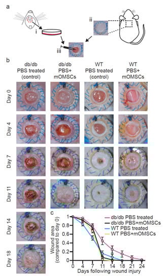 (a) Schematic drawing of wound-healing model for the evaluation of the therapeutic potential of mouse oral mucosa stem cells (mOMSCs). i. mOMSCs were isolated from oral mucosa tissue of healthy Balb/c mice. ii. Wound excision. iii. Oral mucosa stem cells of allogeneic Balb/c mice were injected around and under the wound. (b) Change in wound area. Digital photographs showing the change in the wound area over time in WT and db/db PBS + mOMSCs-treated and PBS-treated mice. (c) Kinetics of wound closure. Differences in mean wound area of treated WT and db/db mice with Balb/c mOMSCs + PBS (yellow and black, respectively) and PBS-treated WT and db/db mice (blue and pink, respectively). Each point represents the mean of the percentage in area of the original wound size ± SEM (p < 0.05).