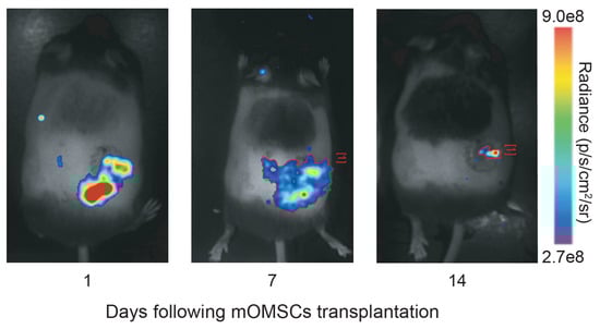 Luciferase-labeled mOMSCs were injected into the wound. Cells were monitored on days 1, 7, and 14 days post-wounding using in vivo bioluminescence imaging performed after the luciferin administration.