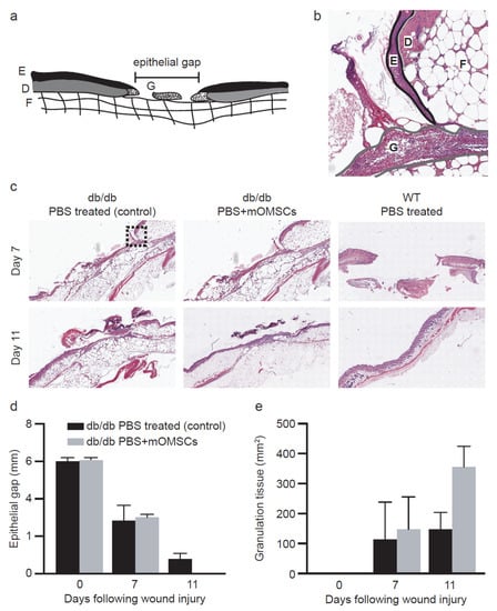 (a) Schematic drawing of histological section of the wound model for evaluation of wound healing. Epithelial gap (EG) and total area of granulation tissue were analyzed using digital image analysis software. E = epithelium, G = granulation tissue, D = dermis, F = fat. Epithelial gap was analyzed using digital image analysis software. Granulation tissue area was measured by tracing regions of granulation tissue and calculating pixel area. The sum of the regions was defined as the GT area. (b) Histological section of wound in db/db mice. E = epithelium, G = granulation tissue, D = dermis, F = fat. (c) Histological comparison of epithelial gap and granulation tissue formation in PBS-treated and PBS + mOMSCs-treated db/db mice and WT control. (d) Comparison of epithelial gap in PBS + mOMSCs-treated and PBS-treated db/db mice. EG was assessed at days 0, 7 and 11 after wounding, H&E staining. (e) Effect of treatment on the rate of GT formation in db/db mice as assessed at days 0, 7 and 11 after wounding