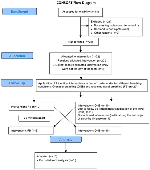 The sample size needed was calculated using the G*Power version 3.1 software [10]. According to the results of the F tests we needed a sample of 20 participants in order to obtain a significant difference between oronasal breathing (ONB) and FB conditions (Statistical test: ANOVA-Repeated measures, within-between interaction. Required input parameters: effect size = 0.25, level of significance α = 0.05, power β = 0.80, number of groups = 2; Number of measurements = 10; Correlation between repeated measures = 0.5, nonsphericity correction ε = 1). Effect size was obtained from the study performed by González-Montesinos et al. [7].