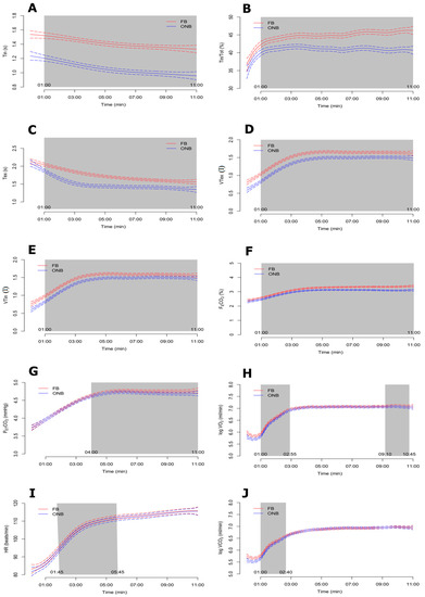 Bayesian functional ANOVA plots for FB > ONB group variables: inspiration time (Tin) (A), inspiratory time fraction (Tin/Tot ) (B), expiration time (Tex) (C), expiratory tidal volume (VTex); (D), inspiratory tidal volume (VTin) (E), fraction of expired carbon dioxide (FECO2) (F), end-tidal partial pressure of carbon dioxide (PETCO2) (G), oxygen uptake (VO2) (H), heart rate (HR) (I) and carbon dioxide production (VCO2) (J).