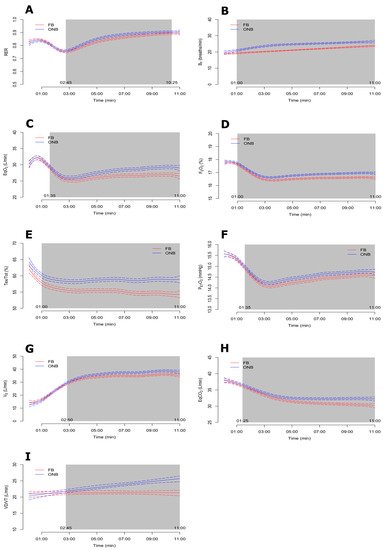 The Bayesian functional ANOVA results for each of the cardioventilatory variables are displayed in Figure 2 and Figure 3, respectively. All the analyzed variables showed significant differences between ONB and FB trials at some point of the test, except VO2 and VCO2, which had differences only at the beginning of the test. The results showed that breathing patterns were more efficient when the tests were performed with FB compared to ONB.