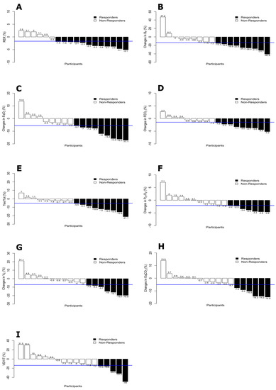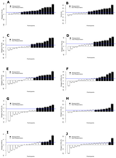 The means, standard deviations and proportions of responders and non-responders for the cardioventilatory variables are shown in Table 2. Tin and VCO2 were the variables with higher and lower proportion of responders respectively (72.2% and 11.1%). Additionally, the percentage of change by participants for each of the variables are displayed in Figure 4 and Figure 5.