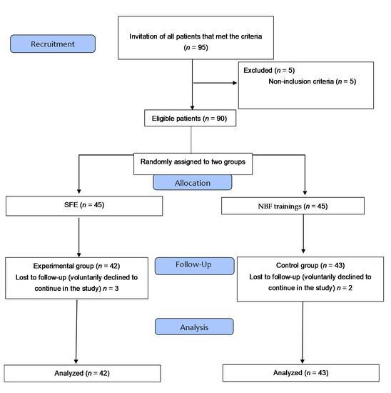 The participants were recruited from among university students, and the data were collected in the Clinical Area of Podiatry of the University of Seville and a private center of podiatry. The exclusion criteria were FPI less than 6 points in either the right or left feet (>6 points needed in both feet to identify pronator individuals) [19], any sign of pain in the lower limbs, current orthopedic treatment, pregnancy, ligamentous hyperlaxity, serious illnesses, osteoarticular surgery of the foot, and previous personal experience with the SFE. The participants (n = 90) who met the inclusion criteria and voluntarily expressed their wish to be part of the research (i.e., gave informed consent) were randomized into two study groups. Lastly, after removing the losses, a total of 85 subjects were divided into an experimental group (n = 42) that practiced IFM with the SFE, and a control group (n = 43) that performed active movements of the flexion and extension of the metatarsophalangeal joints of the foot without biomechanical action (Figure 1).