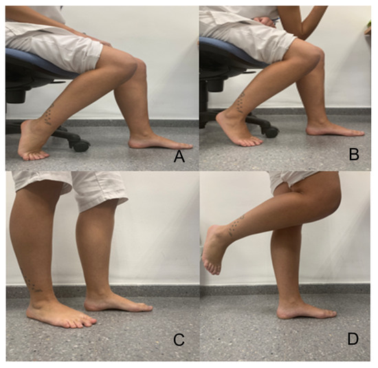 In general, this training aims to bring the first metatarsophalangeal joint close to the calcaneus, keeping the toes extended (which is why it is called the short foot exercise) [17], and has to be done with one foot and then with the other. Daily practice was indicated in this study by carrying out the activity being modified from the 1st to the 4th week (a specific protocol of training, according to the literature, does not exist). Generally speaking, a 4-week to 8-week program is described according to the consulted authors [1,3,4,16,17]. The specific protocol used in this study was considered, according to our criteria. The most appropriate is outlined as follows. In the first week, the patient is in a seated position and performs flexion of the knee at 90°. During the second week, the subject is sitting and allowing loading until the foot performing the SFE moves away from the subject’s upper body. During the third week, the participant is standing. In addition, during the fourth week, the standing position is used on a single limb and, later, loading is on the other foot (Figure 2).