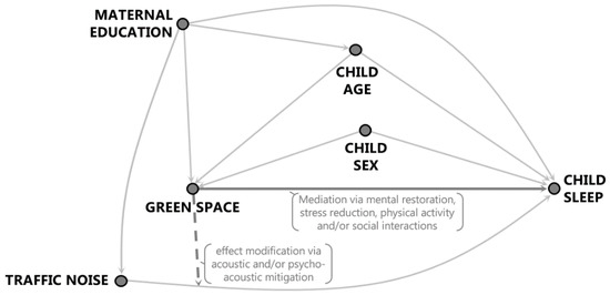 Common causes of sleep-related outcomes in children and adolescents and the probability of living in an area with less green space were determined using published literature to construct a directed acyclic graph (Figure 1). Adjustment for confounding to test the direct effect of green space on child sleep outcomes (Hypothesis 1) took into account child age and sex. Maternal education was also taken into account, not only as a marker of family socioeconomic circumstances that has a significant bearing on where families select to live [49], but also for specific influences on child development that shape sleep trajectories [50], such as impacts of screen-time [51]. These variables were common to data in both countries. Maternal education was measured in both countries according to the number of years the mother spent in education, classified into three categories: (1) less than 10 years, (2) 10 years, and (3) more than 10 years.