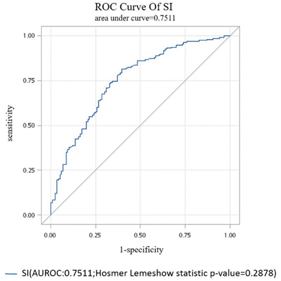 These variables (body temperatures, pulse rates, respiratory rates, systolic and mean arterial blood pressure, shock index) further underwent a backward model selection process using multiple logistic regression analysis. We found that the SI was the only factor that was significantly related to short-term survival in the multiple logistic regression analysis. After adjusting for age, gender, personal medical and medication history, the odds of death at 60 days after the index visit was 1.39 (95% CI: 1.24–1.55; p < 0.0001) times higher among participants with each 0.1 increment of the index. The area under the ROC curve was found to be 0.7511 (Hosmer–Lemeshow statistic p-value 0.2878; Figure 1), while Harrell’s C-index was 0.74.
