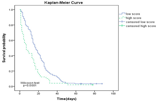 Kaplan–Meier curve of 60-day mortality for advanced cancer patients with SI > 0.94 (high score) and SI < 0.94 (low score).