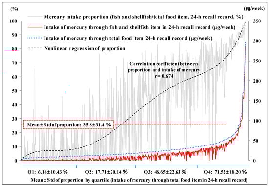 When 711 participants were surveyed using the 24HR, the mean proportion of Hg intake through seafood consumption to total Hg intake through 16 different food groups [± standard deviation] was 35.8% [± 31.4%]. The proportion by quartile according to the total Hg intake increased from the first quartile (6.18% [± 10.43%]) to the fourth (71.52% [± 18.20%]). Namely, as the total Hg intake increased, the proportion also tended to increased. The correlation coefficient between total Hg intake and proportion of Hg intake from fish and shellfish was 0.674 (p < 0.001) (Figure 1).