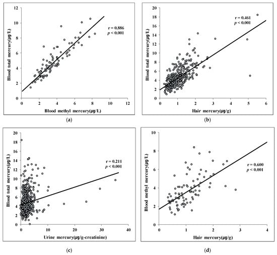 Pearson’s correlation coefficients between blood T-Hg and blood MeHg, hair Hg, and urine Hg were 0.886 (p < 0.001), 0.461 (p < 0.001), and 0.211 (p < 0.001), respectively. Blood T-Hg showed a very strong positive correlation with blood MeHg, while showing intermediate concentration of positive correlation with hair Hg and week positive correlations with urine Hg. A positive correlation was found between blood MeHg and hair Hg (r = 0.600, p < 0.001) (Figure 2).