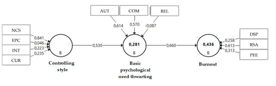 Finally, in the structural model assessment, the effect size (f2) is evaluated [51], with controlling style showing a large effect with psychological need thwarting (0.39) and psychological need thwarting showing a large effect with burnout (0.77).