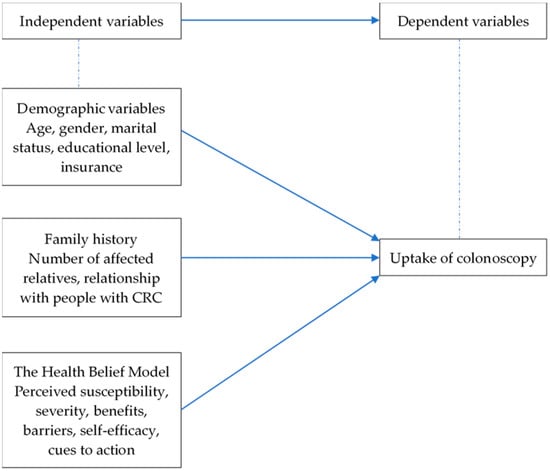 A cross-sectional survey was conducted from March to May in 2019 in Shenzhen, China. A convenience sample of FDRs of people with CRC was recruited through the Nanshan Chronic Disease Management Centre, Nanshan Hospital and 23 community centres. People were eligible if they meet the following criteria: (1) 40–75 or 10 years of age before the relative was diagnosed, (2) individuals with one FDR with CRC at <60 years of age or with two or more FDRs with CRC at any age, (3) have access to WeChat or through close family members living in the same household and (4) can read and speak Chinese. The following individuals were excluded: (1) have a history of cancer or inflammatory bowel disease and (2) with doctor-diagnosed psychiatric illness. Online questionnaires were sent to consenting participants through WeChat. According to the rule of thumb—namely, 10 cases per variable—a sample size larger than 130 was sufficient for 13 independent variables (age, gender, marital status, educational level, insurance, number of affected relatives, relationship with people with CRC, perceived susceptibility, perceived severity, perceived benefits, perceived barriers, self-efficacy and cues to action) to provide accurate inferences in logistic regression [23]. The independent variables and dependent variable are shown in Figure 1.