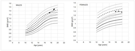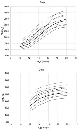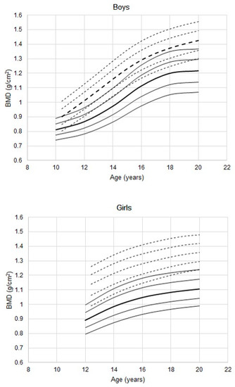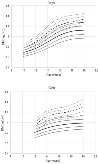Concern for bone health, specifically bone mineral density (BMD) and bone mineral content (BMC), is a major concern given age and gender variation [1,2]. In this context, reference data for a population are routinely used for screening purposes; as such, they are a reference for comparison [1,3,4]. Given changes in BMD and BMC during the course of growth and maturation, there is increased interest in the bone health of children and youth, especially in the context of beneficial effects of regular physical activity on BMC [5,6,7]. Evidence is also consistent in showing beneficial effects of systematic training for sport on BMC [8,9]. Mechanical loading associated with regular training has a significant influence on skeletal development and bone maintenance. Regular intensive exercise with considerable mechanical loading in athletes is associated with an increase in absolute and relative bone dimensions and structural parameters. In contrast, inadequate bone development per se and some practices associated with specific sports, e.g., extreme weight control measures and disordered eating, can negatively influence performance and can increase the risk for bone stress injuries. Understanding bone development in young athletes may inform training practices, leading to success in sport, facilitate the diagnosis of structural abnormalities in bone, and contribute to the prevention of skeletal injuries [10,11,12].