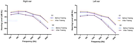 At baseline, the hearing thresholds for the right and left ears were 26.0 (±8.9) and 22.3 dB (±8.4), respectively, obtained at 500 Hz, and of 68.7 (±20.4) and 64.7 dB (±22.9), respectively at 8000 Hz. After auditory training, the thresholds decreased and an improvement in hearing thresholds from 250 Hz to 500 Hz was observed in both ears, even though the criterion for statistical significance was not reached (p ≥ 0.05). As depicted in Figure 1, similar findings were observed regarding hearing thresholds at different frequencies according to the groups G1 and G2.