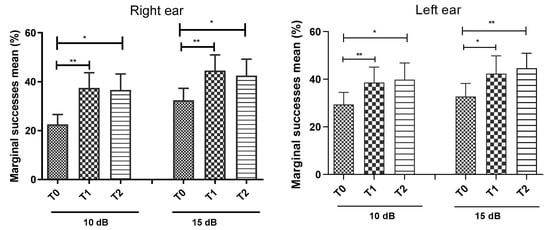Representation of the marginal success means obtained in T0, T1 and T2 for an SNR of 10 and 15 dB in right ear (left panel) and left ear (right panel). * p < 0.05; ** p < 0.01.