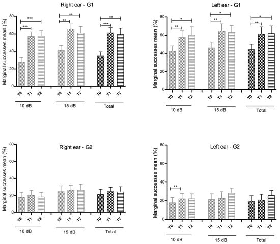 Representation of marginal successes mean obtained at T0, T1 and T2 for a signal to noise ratio of 10 dB, 15 dB and total in group 1 (G1—upper panel) and group 2 (G2—bottom panel) for the right ear (left row) and left ear (right row). * p < 0.05; ** p < 0.01; *** p < 0.001.