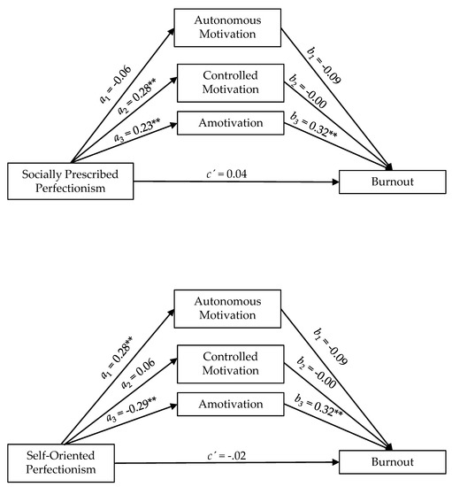 Previous research in sport also provides insight into the mediating role of motivation regulations in the relationships between perfectionism and athlete burnout. Appleton and Hill’s study [17], for example, showed that amotivation mediated the positive relationship between socially prescribed perfectionism and some burnout symptoms, whereas amotivation and intrinsic motivation mediated the negative relationship between self-oriented perfectionism and burnout symptoms. The study of Jowett et al. [36] showed that autonomous and controlled motivation partially mediated the relationship between perfectionism and athletes’ burnout. Specifically, perfectionistic concerns showed a positive direct and indirect relationship with burnout, via controlled motivation. Perfectionistic strivings, in contrast, showed a negative direct and indirect relationship with burnout via autonomous motivation. Finally, a more recent study by Madigan, Stoeber, and Passfield [37] using a longitudinal design showed that autonomous motivation mediated the negative relationship between perfectionistic strivings and burnout, whereas controlled motivation mediated the positive relationship between perfectionistic concerns with burnout.