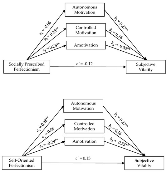 Graphic representation of forms of motivation as mediators between socially prescribed perfectionism and self-oriented perfectionism with subjective vitality. ** p < 0.01; * p < 0.05.