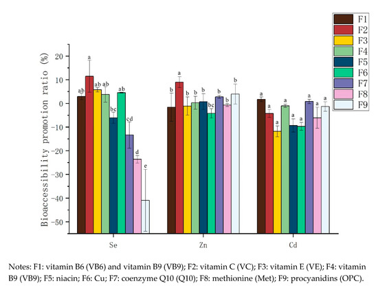 The total PR was obtained by comparing the total bioaccessibility of Se, Zn and Cd in response to various dietary supplements with that of the control group during the gastrointestinal simulation (Figure 1). As can be seen, the order of bioaccessibility of Se in rice was as follows VC > VE > Cu > VB9 > VB6 > VB3 > Q10 > Met > OPC, among which, VB6, VC, VE, VB9, and Cu increased the bioaccessibility of Se, whereas niacin(VB3), coenzyme Q10 (Q10), methionine (Met) and procyanidins (OPC) decreased their bioaccessibility, with OPC, Met and Q10 exhibiting the most significant effects. Xu et al. [38] believed that the chelation of exogenous substances and elements would reduce the bioavailability of elements, and the compound effect between substances was the reason for the improvement of element bioavailability. In this study, VE, VC, VB6 and VB9 significantly improved the bioaccessibility of Se in rice, which suggested that these dietary supplements may have a complex effect with Se in rice, making Se more accessible biologically. Previous studies also have shown that, compared with that after supplementation with Se alone, supplementation with, VB6 [39], VC [40], VB9 [3] and VE [41] can increase the uptake and use of Se by organisms. OPC and Q10 may chelate with selenium and reduce the bioaccessibility of Se. Previous studies have shown that supplementation of methionine can improve the utilization rate of selenium, especially the GPx activity of the organism [42]. However, in our study, Met inhibited the bioaccessibility of Se. The reason may be that Se and S within Met are homologous elements with similar physical and chemical properties [43], and there is competition between their absorption [43].
