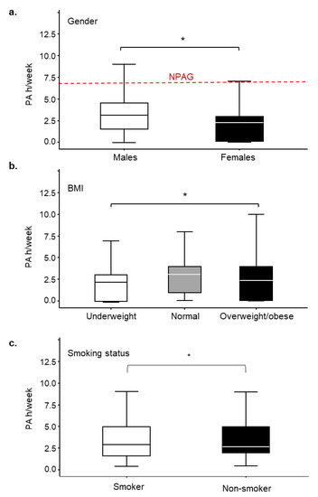 The relationship between the levels of physical activity and gender, body mass index (BMI) or smoking status in 16–18-year-old adolescents (n = 414). (a) Differences of physical activity levels between males [mean (standard deviation (SD)): 3.23 (2.70), n = 200] and females [mean (SD): 2.27 (2.62), n = 214]; (b) Differences of physical activity levels between BMI categories [mean (SD): underweight 2.18 (2.60), normal 3.00 (2.95), overweight/obese 2.30 (2.42)]; and (c) Differences of physical activity levels between smokers [mean (SD): 2.8 (2.83)] and non-smokers [mean (SD): 2.6 (2.55)]. Red dashed line indicates the UK National Physical Activity Guidelines (NPAG) recommended for those between the ages of 5 to 18 years old. Gender * p-value 0.0216, odds ratio (OR) 0.61 (0.404, 0.930); BMI (normal and overweight/obese) * p-value 0.0038, OR 2.15 (0.951, 4.854); smoking * p-value 0.0413, OR 1.82 (1.025, 3.247).