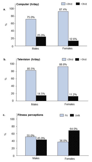 Differences in leisure-time sedentary screen behaviours and fitness perceptions between male (n = 200) and female adolescent students (n = 214). (a) Percentages of students engaged in leisure-time computer activity (h/day). (b) Percentages of students engaged in leisure-time television (TV) activity (h/day). (c) Percentages of students separated by self-assessed fitness perception. The influence of physical activity levels are given by the p-values and odds ratios (OR) that follow: sedentary behaviours including (a) computer (h/day), p-value 0.0067, OR 1.887 (1.192, 2.985) and (b) watching television, p-value 0.0052, OR 0.402 (0.213, 0.762); (c) fitness perceptions, p-value < 0.0001, OR 0.325 (0.208, 0.507).
