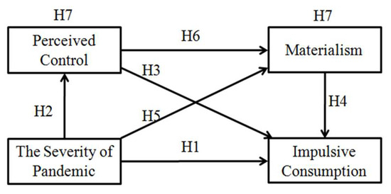 Based on the rationale above, we proposed that the severity of a pandemic could affect people’s impulsive consumption in two ways. First, the severity of a pandemic can increase the uncertainty of individuals’ external environment, reducing their perceived control [16]. Losing control makes them more likely to react impulsively when making purchasing decisions [25,26]. Second, according to terror management theory, the fear of death, which grows with the severity of a pandemic, can lead to an increase in individuals’ materialistic tendencies [40,41]. Materialism often makes people consume impulsively [38,39]. To sum up, the severity of a pandemic increases people’s impulsive consumption either by reducing their perceived control or by increasing their materialistic tendencies, that is, perceived control and materialism both mediate the effect of the severity of a pandemic on consumers’ impulsive consumption. Thus, we proposed the following theoretical model shown in Figure 1, as well as the hypothesis for the meditating effects as follows: