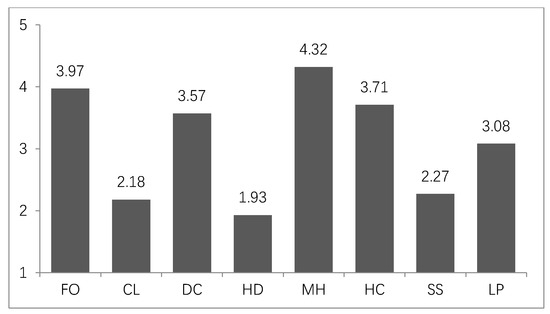 As shown in Figure 2, the descriptive analysis revealed that residents’ impulses toward different types of consumption are distinctive. The item with the most impulsive consumption was medical and health care products (MH) that were the most helpful for coping with the pandemic and, thus, were scarce. Foods (FO) and daily consumables (DC) were also more impulsive consumption items, which may be due to residents wanting to reserve more resources amid the risk and uncertainty during the pandemic. Hedonic consumption (HC) and luxury products (LP) were also more impulsive consumption items. This may be because these types of item can help residents relieve negative emotions by obtaining self-satisfaction. However, residents’ consumption impulses for clothing (CL), household durable products (HD), and social spending (SS) were lower than for other items.
