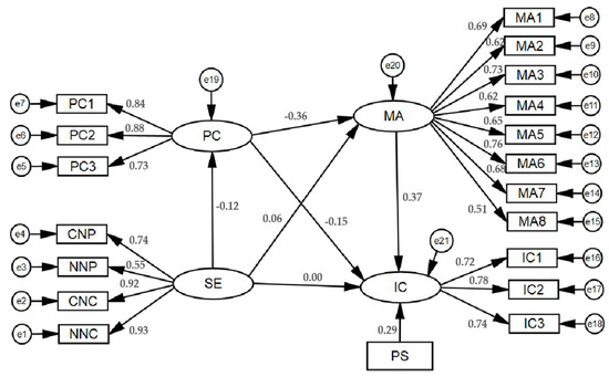 The analysis of mediating effects was conducted using a bootstrapping procedure described by Preacher, Rucker, and Hayes [48]. This approach includes procedures that compute a 95% confidence interval (CI) for the total effect, indirect effect, and direct effect. If a CI does not include zero, it indicates that the effect is significant. The results are shown in Table 6. The total effect of the SE on the IC was significantly positive (β = 0.060, 95% CI: 0.005 to 0.118), which means the SE has a positive effect on the IC. Hypothesis 1 (H1) was verified. The indirect effect of PC and MA between the SE and the IC was significantly positive (β = 0.057, 95% CI: 0.032 to 0.083), while the direct effect was not significant (β = 0.003, 95% CI: −0.049 to 0.056). This suggests that PC and MA play fully mediating roles between the SE and the IC. Hypothesis 7 (H7) was verified.
