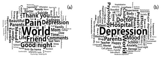 Online communities can provide timely social support and overcome geographical restraints []. The anonymous nature of online communities makes participants feel secure [,]. Therefore, research has generally indicated that online communities have a positive effect on people with depression [,,,]. However, most of these results are based on management depression communities (MDCs), which feature community managers and support groups, and most are only open to English speakers. Because of China’s unique cultural background, individuals are more ashamed than Westerners in disclosing their depression []. The scarcity of mental health services and resources in China leads to 90% of individuals with depression not being treated []. Therefore, a large number of people with depression gather on Chinese online communities. However, China’s online depression communities are still in their infancy and have numerous management problems. For example, some Chinese online depression communities do not have managers; therefore, we named them “lacking-management depression communities” (LDCs). In such communities, members can speak without any restrictions, including the discussion of suicide behaviors and suicidal ideas. The largest of LDCs includes more than 600,000 members.