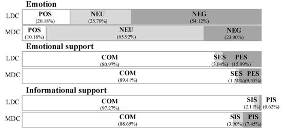 Figure 2 shows the proportion of postings of each type in the two communities after classification. Regarding emotion, it can be seen that more than half of the postings in the LDC expressed negative emotion, while in the MDC, most postings expressed neutral emotion. In terms of social support, postings regarding emotional support in the LDC were more than those in the MDC, and postings regarding informational support in the MDC were more than those in the LDC.