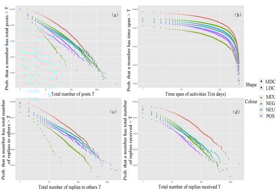 The community engagement of each group in terms of emotion is shown in Figure 4. In the LDC, the productivity and loyalty of the negative emotional group were the highest of all the groups and they did not actively communicate but received high attention. The positive emotional group was not active in the community. In the MDC, the mixed group was the most active of all the groups; the productivity, loyalty, and social activity of the negative emotional group were significantly lower than those of other groups. It can be seen that members with negative emotion were more dependent on the LDC.