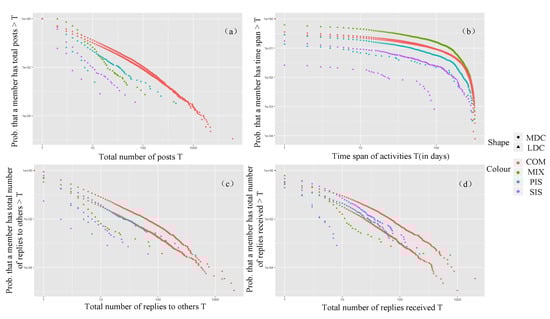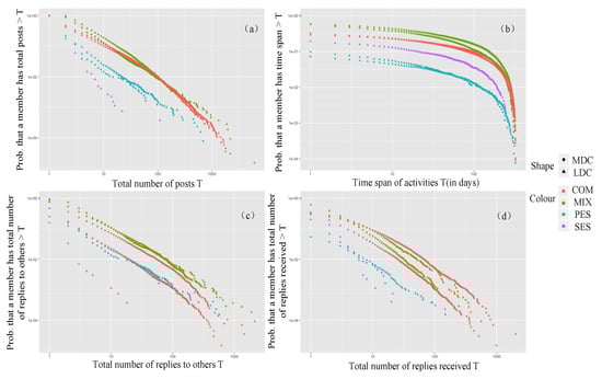 As shown in Figure 5, the emotional support seekers and providers in both communities were not active. Among them, the productivity, social activity, and attention received of emotional support providers in the LDC were higher than those of the seekers. Although emotional seekers spent much time in the LDC, they did not receive attention. This may be due to their low level of productivity and social engagement in the LDC. In the MDC, there was no obvious division of emotional support seekers.