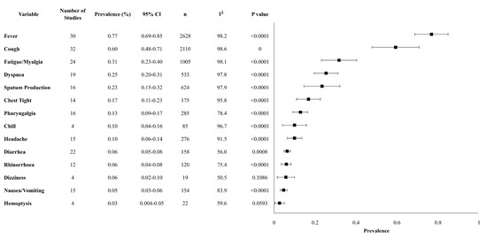 Our review analyzed 14 clinical characteristics. The most prevalent clinical characteristics were fever and cough. Fever occurred in 76.8% (95% CI 68.7–84.9%), cough occurred in 59.3% (47.8–70.8%), and fatigue/myalgia occurred in 31.7% (23.1–40.4%) of patients. Upper and lower respiratory symptoms were reported less frequently, with dyspnea in 25%, sputum production in 23%, chest tightness in 17%, pharyngalgia in 13%, and rhinorrhea in 6% of patients. Gastrointestinal symptoms, including diarrhea and nausea/vomiting occurred in 6% and 5% of patients, respectively. The above-mentioned prevalence was statistically significant, with a p-value < 0.01 (Table 2). The overall meta-analysis results of the clinical characteristics are shown in Figure 1.