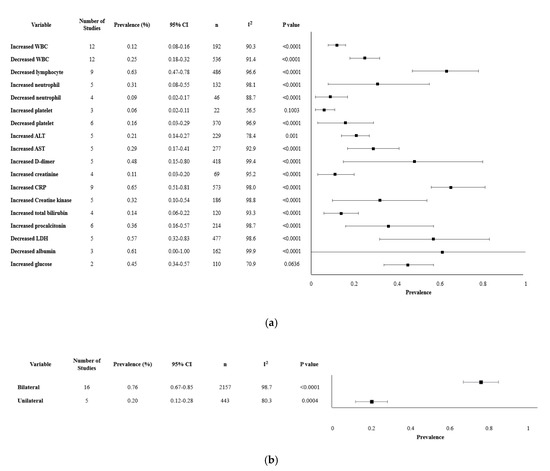 Our review analyzed about 18 laboratory findings and 2 chest imaging. The most significant findings were lymphocytopenia (62.7%, 95% CI 47.1–78.3%), decreased albumin (60.6%, 95% CI 0–100%) and increased lactate dehydrogenase (LDH) (57.4%, 95% CI 31.7–83.1%). Other clinically meaningful changes observed were an increase in liver function enzymes, including alanine aminotransferase (ALT), aspartate aminotransferase (AST), and total bilirubin, with altered levels reported in 28.9% (95% CI 23.9–33.9), 34.2% (95% CI 28.6–39.7) and 10.7% (95% CI 6.6–14.8) of the cases. CRP, a marker of inflammation, was significantly elevated with mean levels of 22.8 mg/L (95% CI 16.1–28.2). Specific laboratories and their variability, reported as an increase or decrease in the values, are presented in Table 2. Imaging methods such as chest computed tomography (CT) and X-rays revealed that 75.8% (95% CI 66.9–84.8%) had bilateral lung involvement, while 19.9% (95% CI 11.7–28.0%) had only unilateral findings (Table 2). The overall meta-analysis results of the laboratory findings and imaging are shown in Figure 2.
