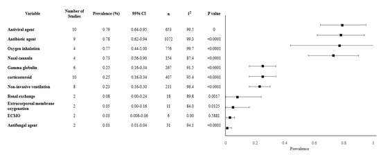 Our review analyzed 11 different treatments modalities and revealed interesting findings. The most common treatment approaches had a similar range of prevalence and included antiviral measures (79.4%, 95% CI 63.6–95.2%), antibiotics (77.7%, 61.5–93.9%), and oxygen inhalation (77%, 95% CI 43.9–100%). Other treatment modalities such as gamma-globulin, and the use of corticosteroids were less common, used in less than a third of the patients. Other treatments for severe cases that were observed in less than 10% included non-invasive ventilation, renal replacement therapy, and extracorporeal membrane oxygenation. (Table 3). The overall meta-analysis results of the treatments modalities are shown in Figure 3.