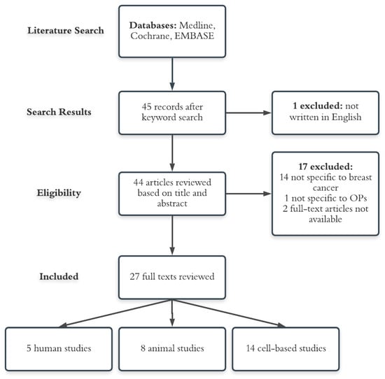 Pubmed, EMBASE, and Cochrane databases were used to conduct a systematic search based on the PRISMA guidelines (www.prisma-statement.org) for published literature on organophosphates and breast cancer development until 24 April 2020. The following search terms were used: (chlorpyrifos[Title/Abstract] OR acephate[Title/Abstract] OR malathion[Title/Abstract] OR naled[Title/Abstract] OR phorate[Title/Abstract] OR dicrotophos[Title/Abstract] OR dimethoate[Title/Abstract] OR terbufos[Title/Abstract] OR phosmet[Title/Abstract] OR ethoprophos[Title/Abstract] AND (breast[Title/Abstract] OR mammary[Title/Abstract]). These OP search terms were selected because they were listed as the top 10 most commonly used OPs in 2012 according to the U.S. EPA Pesticide Industry Sales and Usage 2008–2012 report [], and are currently considered the most widely used OPs according to the 2019 Mordor Intelligence Global Organophosphate Pesticide Market report []. This search in PubMed resulted in 45 papers. No additional papers were identified by conducting the same search in Cochrane and EMBASE databases. One was excluded because it was not in English. Upon reading through the remaining 44 abstracts, two authors (KJY and HLP) agreed on the inclusion of 27 papers in this review. Studies were included if they were peer reviewed, written in English, and: (i) reported relative ratio (RR), hazard ratio (HR), or odds ratio (OR) with 95% confidence intervals (CI) on the association between the OP(s) and breast cancer risk in humans; or (ii) examined potential relationships between OP(s) and breast cancer development using animal or cell culture models. A flow chart summarizing the selection process is shown in Figure 1.