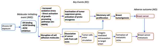 Studies discussed in this review also observed increased cholinergic activity in OP-treated breast cancer cells and animal models [,,]. Whether this can be attributed to higher ACh levels due to the anticholinesterase effects of OPs or to the OPs acting directly on acetylcholine receptors (AChRs) as agonists is unclear. Of the two types of AChRs, muscarinic (mAChR) and nicotinic (nAChR), activation of the M3 mAChR subtype has been shown to induce proliferation in human breast cells, as well as colon and prostate cells, potentially through activation of the MAPK/ERK pathway []. nAChRs have also been shown to play a role in cell proliferation, tumor invasion, and angiogenesis []. In breast cancer cells specifically, it has been shown that exposure to nicotine increases expression of the alpha-9 subtype of nAChR (a9-nAChR), which in turn promotes cell proliferation and colony formation in the MCF-10A cell line []. With anticholinesterase activity being one of the more widely recognized effects of organophosphates, it may play a significant role in mammary carcinogenesis. An adverse outcomes pathway based on these findings is presented in Figure 2.