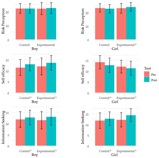 Our comparison of the post-test scores between the groups revealed that the score of information-seeking behavior (sum of the scores for the three information-seeking variables) significantly increased in the experimental group after the program (Control group M = 12.74, SD = 3.21) (Experimental group M = 13.83, SD = 3.42). When comparing the different activities’ groups in girls, the information-seeking scores of the two groups were not significantly different (Education-only group M = 14.50, SD = 3.09) (Education + special activity group M = 14.42, SD = 3.02).