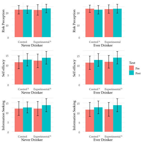 An examination of the results stratified by drinking habits showed that the risk perception and information-seeking scores of the non-drinking students in the experimental group significantly increased after the education, whereas those of the non-drinking students in the control group did not increase significantly. Among the drinking students, there was a significant increase in the self-efficacy and information-seeking scores after the education. However, a significant increase in these two variables was also observed in the control group. The risk perception score of the drinking students in the control group significantly decreased after the education (Figure 2).