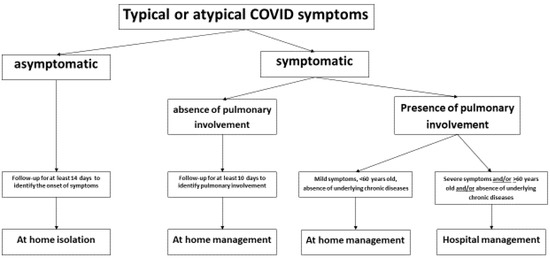 COVID-19 may present a varied clinical picture, such as asymptomatic carriage, with or without associated pneumonia, and with or without several extrapulmonary manifestations [50,51,52]. Figure 1 shows a possible management plan for patients according to their clinical presentation. Asymptomatic patients with nasopharyngeal swabs positive for SARS-CoV-2 rt-PCR should be followed for 14 days to evaluate the appearance of symptoms. Similarly, patients with mild symptoms arising after more than 10 days, and without evidence of pneumonia, can be managed at home with periodic telephone evaluation. However, patients with evidence of pulmonary involvement, especially in patients over 60 years of age, and/or with a comorbidity, and/or the presence of severe extrapulmonary manifestations, should be admitted to a hospital for careful clinical-laboratory monitoring with periodic blood gas analysis, blood count, liver and kidney function evaluation, dosage of procalcitonin, reactive protein C, and D-dimer. In these patients, it is also important to do a radiological follow-up with lung CT [53].