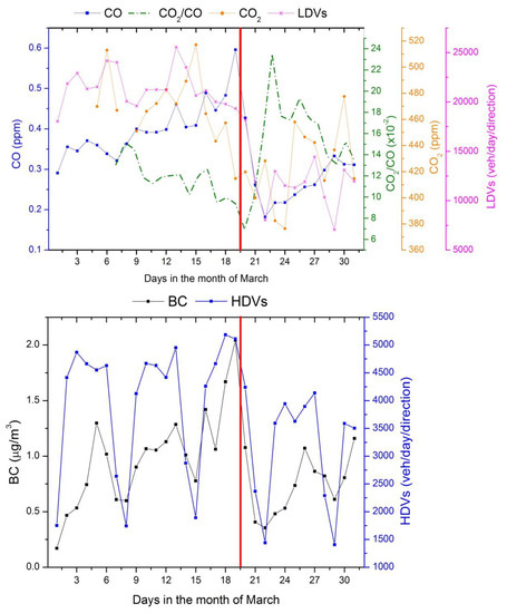 - Tobías, A.; Carnerero, C.; Reche, C.; Massagué, J.; Via, M.; Minguillón, M.C.; Alastuey, A.; Querol, X. Changes in air quality during the lockdown in Barcelona (Spain) one month into the SARS-CoV-2 epidemic. Sci. Total Environ. 2020, 726. [Google Scholar] [CrossRef]