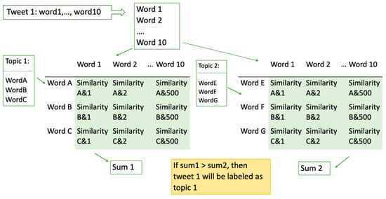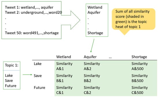Topic heat is calculated in the form of total similarity of the words related to the topic. Consider a table, where column heads are the words in the topic and the row head are words from the targeted word corpus, as illustrated in Figure 1. The cell of the matrix is filled by the similarity between the row and column the cell is at. Then, do the same for all cells in the table, and the sum of all cells in the table will be the topic heat of the targeted word corpus. In this study, we calculated topic heats for all topics regarding each individual tweet (see Figure 2).