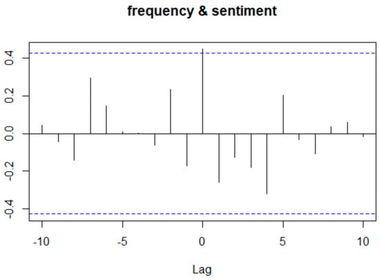 Auto correlation between tweet frequency and proportion of negative sentiment. Note: “Lag” on the horizontal axis refers to the number of time points that are different between A and B (in graph title). The black vertical line shows correlation between B at time x and A at time (x + lag), and the blue horizontal dash indicates the threshold of significance. If a black vertical line is taller than the blue horizontal dash, the correlation between A and B at that lag is considered statistically significant.
