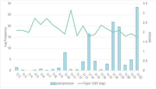 Precipitation and log frequency of tweets under topics 1, 2, 6, or 7 *. * Note: topics refer to the following: 1 (“Lake save future”), 2 (“Conserve government waste”), 6 (“Pond rainwater nature”), and 7 (“Tap world important”).
