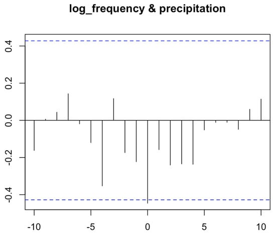 Although the correlation between the total number of tweets per day and precipitation is not significant (p = 0.119), it is observed that topic 1 (“Lake save future”), 2 (“Conserve government waste”), 6 (“Pond rainwater nature”), and 7 (“Tap world important”), which are with high numbers of tweets, appear to be negatively correlated with precipitation (Figure 4). Through the cross-correlation test (Figure 5), it is confirmed that the log frequency of the sum of the tweets under these topics has a significant negative correlation (p = 0.043) of −0.446 with precipitation simultaneously. In other words, tweets mentioning topics 1, 2, 6, or 7 decreased in number when precipitation levels increased during the Chennai water crisis.