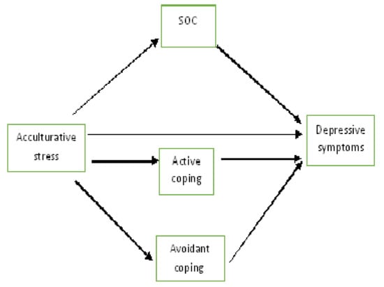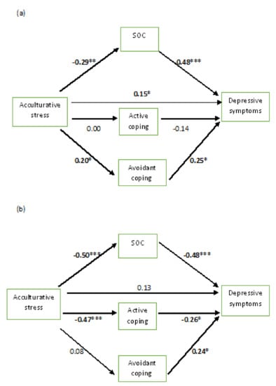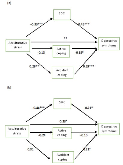 4.6. The Direct and Indirect Effects of SOC and Coping Strategies on the Association Between Acculturative Stress and Depressive Symptoms