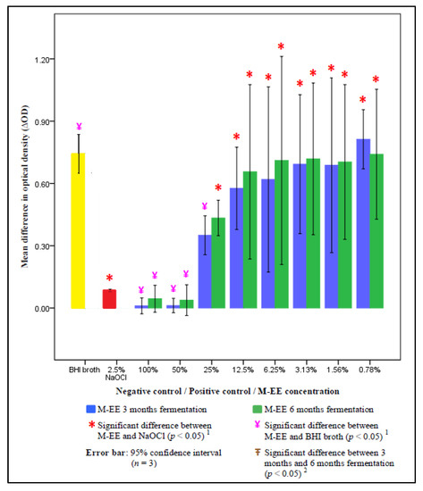 Mean difference in optical density between M-EE of different concentrations at 3 and 6 months fermentation, NaOCl, and BHI broth. 1 One-way analysis of variance (ANOVA): Difference between M-EE, NaOCL, and brain-heart infusion (BHI) broth (p < 0.05). 2 Independent-samples T-test: Difference between fermentation periods (p < 0.05).
