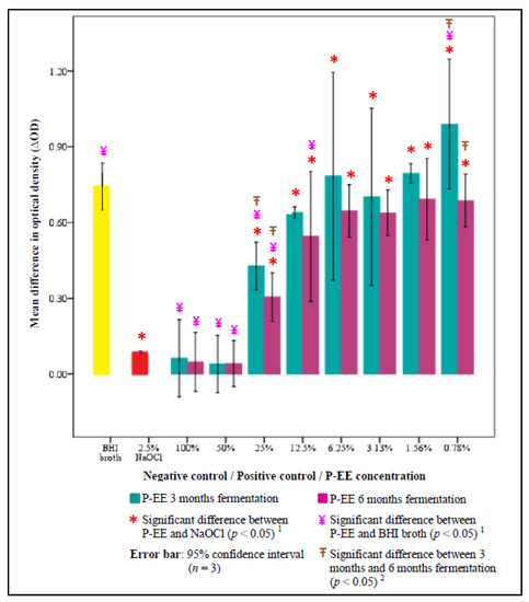 Results were analyzed with the data collected from M-EE and P-EE of different concentrations at a 3 and 6 months fermentation period, NaOCl, and BHI broth, using Statistical Package for the Social Sciences (SPSS) Version 23 software (IBM, Armonk, NY, USA). The results from direct visualization in MIC and MBC tests were descriptively documented. The comparisons of mean difference in OD between M-EE and P-EE of different concentrations with 2.5% NaOCl (positive control group) and BHI broth (negative control group) at the two fermentation periods were tested using one-way analysis of variance (ANOVA). A univariate ANOVA was used to test within-subject effects and Bonferroni multiple comparisons were performed to detect differences in mean OD difference over the M-EE, P-EE, positive and negative control groups. The comparison of the mean difference between two fermentation periods for each tested group was analyzed using the independent-samples T-test. All tests were set at a significant level of 0.05.