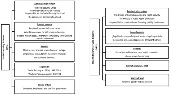 Thailand has been a popular destination for migrant workers in the Southeast Asia Region for many years. The majority of immigrants travel from neighbouring countries, especially Cambodia, Lao PDR, and Myanmar (CLM) [6]. In 2018, the number of migrants in Thailand was approximately three to four million, and about one and a half million crossed the border without a valid passport or travel pass and were recognised as undocumented migrants [7]. As there is a concern about national security, the Thai government established the One Stop Service (OSS) and the Management Center for Migrant Workers (MCMW) as a mechanism to legalise undocumented migrant workers. The role of both authorities is to record personal data, coordinate with the health sector for health examinations, and work with the Ministry of Interior (MOI) to issue legitimate residence permits and cooperate with the Ministry of Labour (MOL) to issue work permits. All of these functions are known as the nationality verification (NV). In terms of health protection, public health insurance for migrants is one of the most important areas of social policies in Thailand. Overall, the Thai government has implemented two main insurance schemes. The first is the Social Security Scheme (SSS) which covers formal sector workers regardless of their nationality (Thai nationals in the formal sector are also enrolled in the SSS). Migrant workers in formal sector, in theory, need to be insured; the SSS is a compulsory insurance scheme that regulates employers to contribute to a payroll tax, which is equally shared by their employees. The scheme is financed by tripartite contributions. Migrant workers need to pay 5% of their income to the SSS fund, with employers’ subsidies at 5% and the Thai government’s at 2.75% [8]. The second scheme is the Health Insurance Card Scheme (HICS), regulated by the Division of Health Economics and Health Security at the Thai Ministry of Public Health (MOPH). The HICS covers migrant workers in the informal sector from CLM nations [9] (see Figure 1).